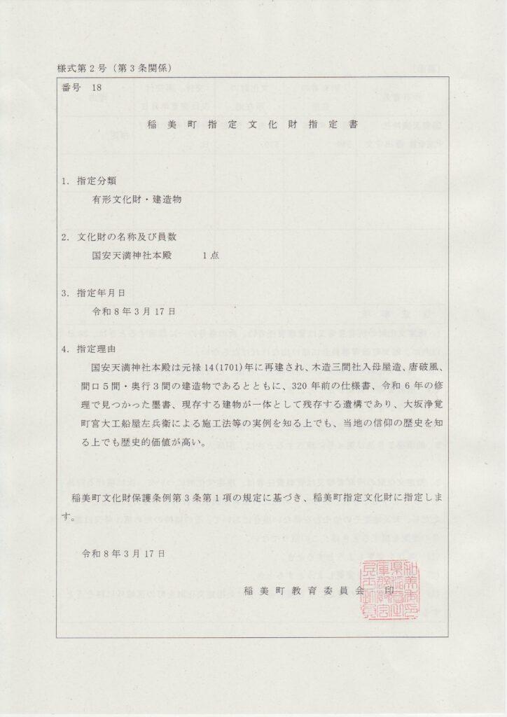 国安天満神社本殿は元禄14(1701)年に再建され、木造三間社入母屋造、唐破風、間口5間・奥行3間の建造物であるとともに、320年前の仕様書、令和6年の修理で見つかった墨書、現存する建物が一体として残存する遺構であり、大坂浄覚町宮大工船屋左兵衛による施工法等の実例を知る上でも、当地の信仰の歴史を知る上でも歴史的価値が高い。